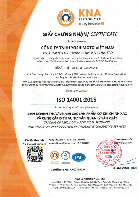 Chứng chỉ ISO 9001 và ISO 14001 không chỉ là sự ghi nhận cho những nỗ lực đã qua, mà còn là nền tảng vững chắc để Công ty TNHH Yoshimoto Việt Nam tiếp tục khẳng định uy tín, nâng cao năng lực cạnh tranh và phát triển mạnh mẽ trong tương lai.