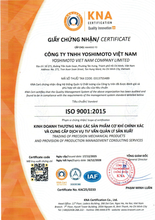 ISO 9001:2015 là tiêu chuẩn quốc tế về Hệ thống Quản lý Chất lượng, thể hiện cam kết của Yoshimoto Việt Nam trong việc không ngừng cải tiến quy trình, nâng cao chất lượng sản phẩm/dịch vụ và đáp ứng tối đa nhu cầu của khách hàng.